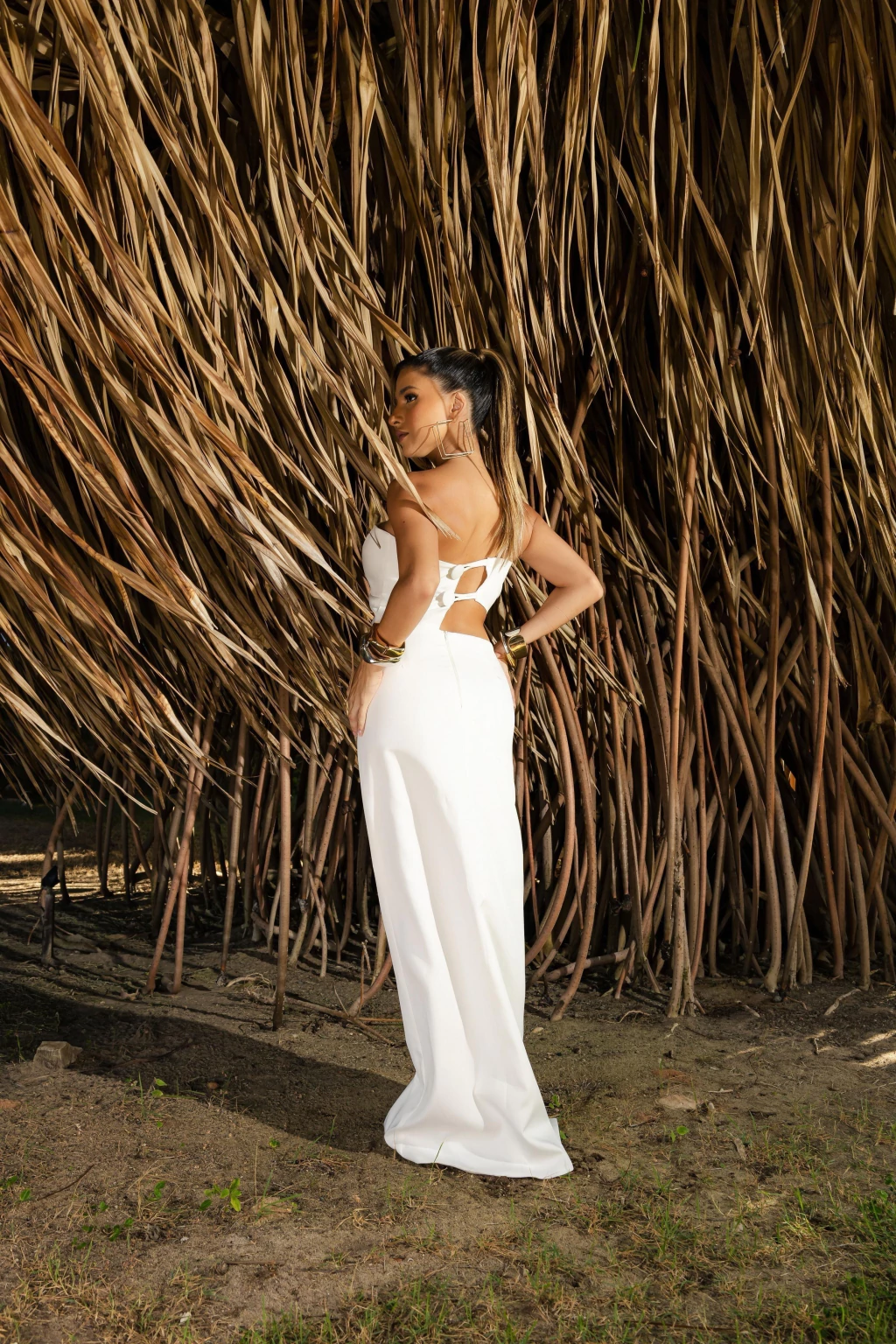 A fenda lateral alonga a silhueta e traz movimento à peça, deixando o visual leve, sensual na medida e extremamente refinado. Nas costas, o recorte valoriza a região sem exageros, mantendo o equilíbrio perfeito entre ousadia e sofisticação.